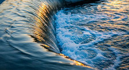 Water flowing over a concrete barrier, creating a small cascade with white foam and bubbles. Golden sunlight reflects on the rippling water surface, highlighting the dynamic movement and natural flow.