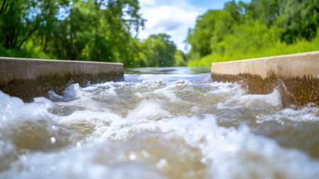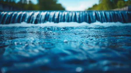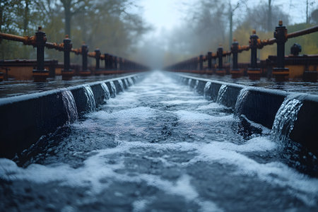 Industrial water filtration system seen from a low angle, focusing on the dynamic movement of water across the treatment channels. the scene highlights the engineering and environmental importance of water purification processes. Generative AI