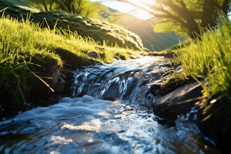 AI Generated. Serene Water Flow in a Rural Sunset Setting