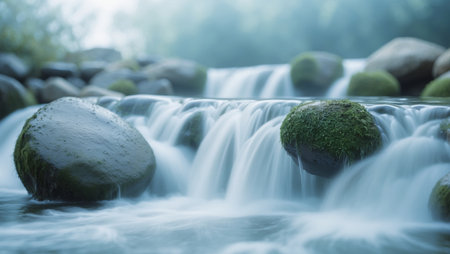 AI Generated. Tranquil Waterfall in Motion with Soft Blue Hues and Gentle Cascade Over Rocks Creating a Serene Landscape Perfect for Relaxation and Meditation Imagery