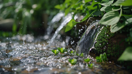 Serene nature scene featuring a small waterfall flowing over rocks in a lush forest setting. The clear water sparkles in the sunlight, creating a peaceful and refreshing atmosphere.