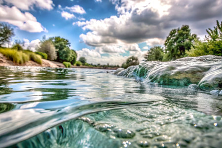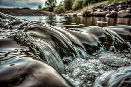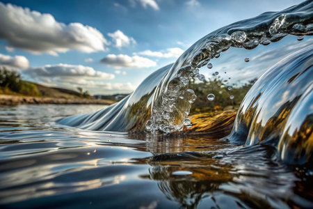 Experience the invigorating purity of crystal clear water as it gracefully flows over natural textures. This dynamic scene captures refreshing splashes and mesmerizing ripples, perfect for conveying vitality, nature, and a sense of pure, clean energy.
