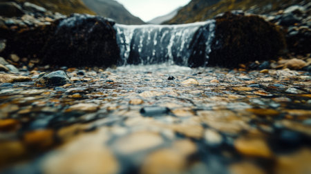 A small waterfall flows over rocks and stones, creating a serene environment. The composition features various shades of brown and grey, suggesting an outdoor setting with sunlight. This image could be used for various projects related to nature, relaxation, or environmental concepts.