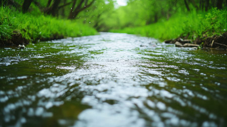 A peaceful stream gently flows through vibrant green foliage, creating a serene atmosphere in nature. Ideal for showcasing the beauty of the outdoors and tranquility.