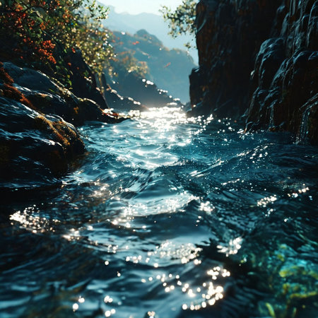 Sunlit stream with rocks creating dynamic water reflections