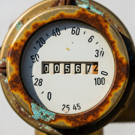 A detailed view of a white watt-hour meter with a mechanical counter showing 0502. The meter is mounted on a textured surface, with a blurred background.