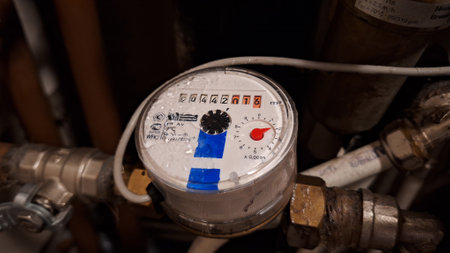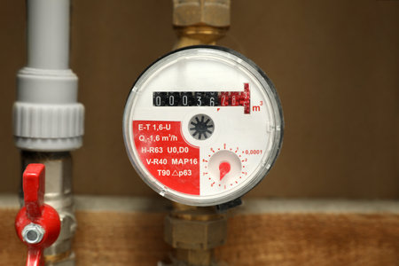 Row of industrial pipelines and valves with green wheels on grey wall for check the standard water level located at the dormitory for check the price of the water. closeup view.