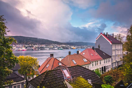 Tiled rooftops of houses in the beautiful Bergen bay in autumn, Norway