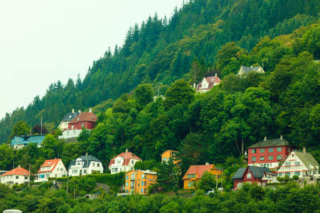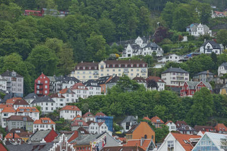Tourism and travel. Cityscape town houses on hills in city Bergen, Norway Europe.