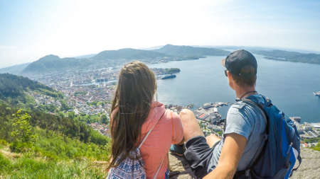A couple sitting on an edge of the rock. He wears a big hiking backpack. A beautiful and breathtaking view on Bergen, Norway, seen from the hill above the city. Endless fjords joining the sea.