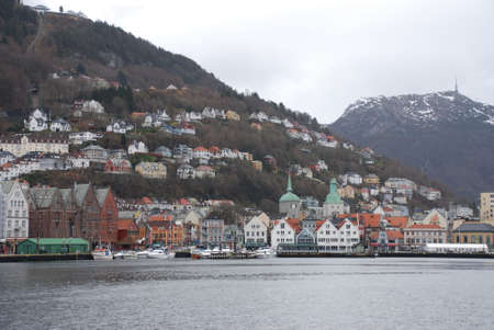 Bergen, Norway - Jule, 2016: View of the city of Bergen on the background of mountains.