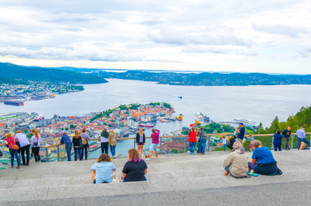 BERGEN, NORWAY, AUGUST 22, 2016: People are looking at the norwegian city Bergen from the floyen viewpoint.