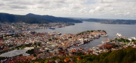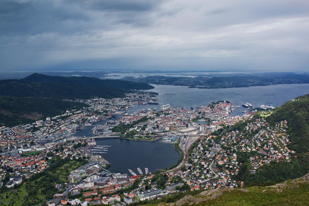 View of Bergen Norway from Ulriken mountain. Ulriken is the highest of the Seven Mountains that surround the city of Bergen, Norway.