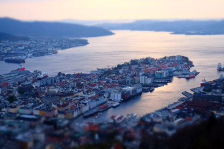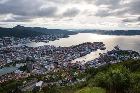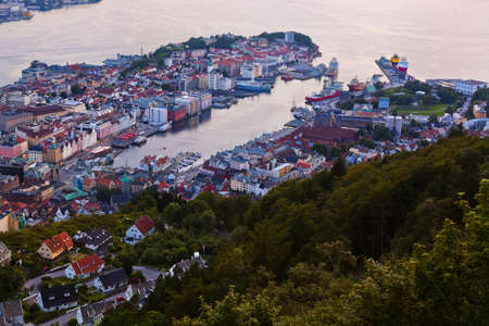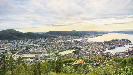 cityspace. view from hill of city bergen and fjord landscape evening scenery, norway