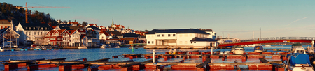 Empty berth for your boat. Red floating wharf. In the background, buildings and bridge port. Winter panorama on the shores of the fjord. Kragero, Telemark municipality. Region of southeastern Norway. Skagerrak coast.