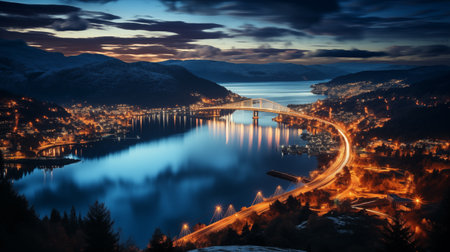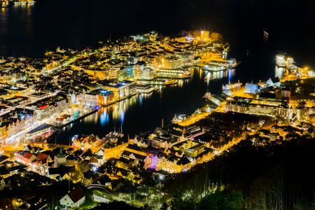 This is a top view of Bergen (the west coast of Norway) in night. The town is illuminated.