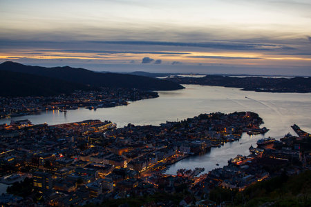 View of Bergen and sunset mountain, sunset city panorama travel, sea