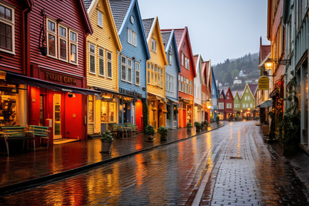 Narrow cobbestone Nedre Strangehagen Street at dusk in the old town of Bergen in Norway
