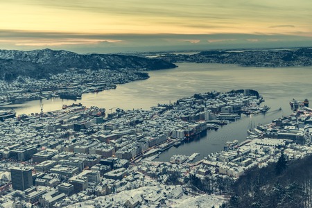 Bergen town at sunset on a misty and foggy day as seen from the top of Mount Floyen, Norway