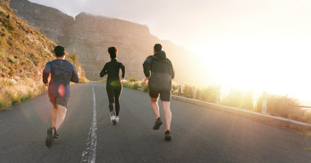 Fitness, running and sports with friends in mountains together for cardio challenge or performance. Exercise, raining or workout with athlete men and woman on asphalt road in nature from back