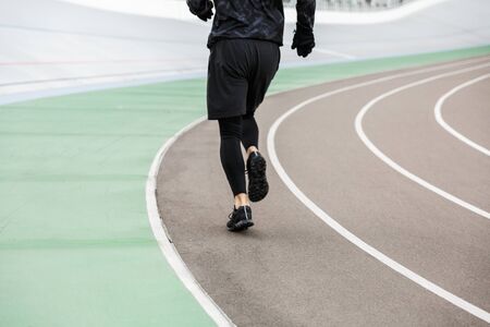 Cropped image of young fit sportsman's legs running on the race track at the stadium outdoors