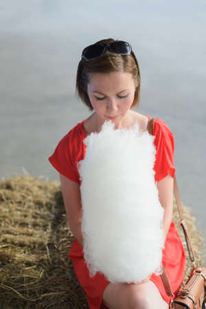 young adult white asian woman in red dress sitting on bale of hay, looking down on cotton candy, thinking about harmful effects of sugar on body, vertical lifestyle stock photo image