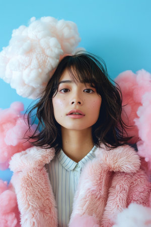 Young Woman in Pink Fluffy Jacket Posing with Cloud Like Pink Cotton Accents on Blue Background AI Generative