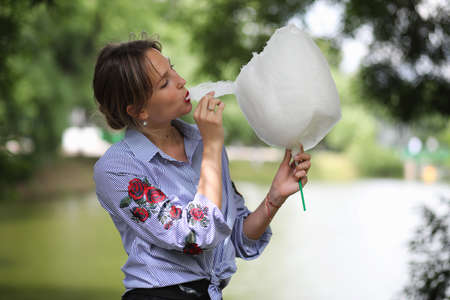 The brunette girl in admiration tears off a piece of cotton candy. Delight and happy eyes from sweet food, hot discounts in stores and a special offer