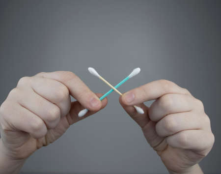 Plastic and bamboo chisels, toppers. A man chooses between a plastic and a wooden ear stick. The concept of protecting the environment from pollution with cotton buds