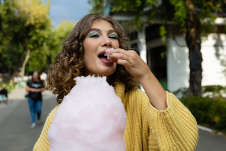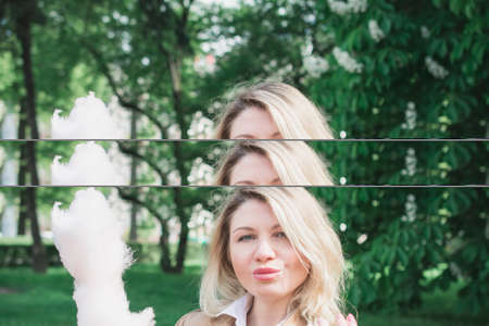 Pretty caucasian blonde stylish woman looking at you camera eating cotton candy outdoors