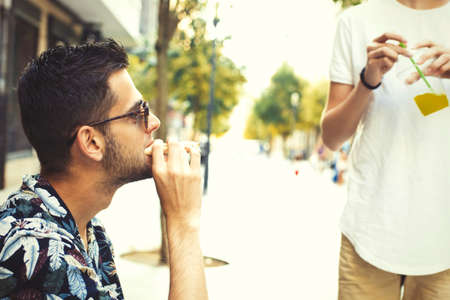 Young man smoking cigarette on the street