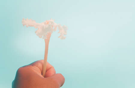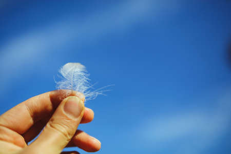 White fluffy bird feather in the hand over blue sky