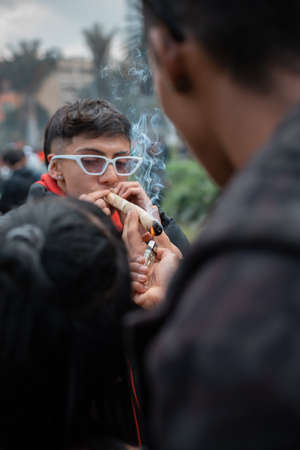 Bogotá, Colombia - April 20th, 2022: young people smoking marijuana from a giant joint