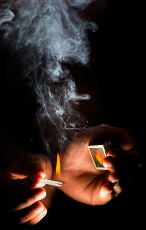 man sets fire to a match on the matchbox. Smoke on black background.
