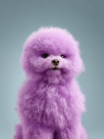 Fluffy purple poodle dog sitting and posing on seamless background