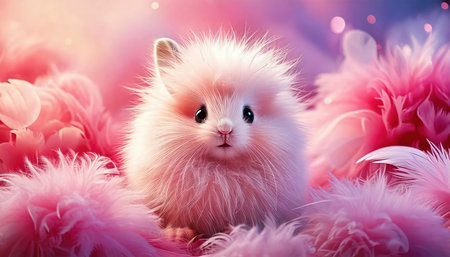 Cute little fluffy white Pomeranian puppy on pink feathers background