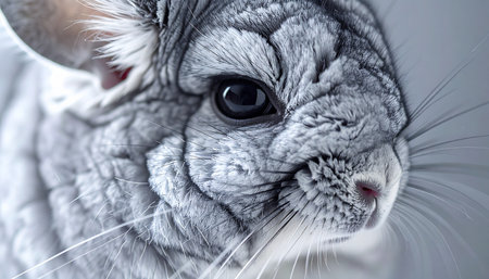An intimate macro photograph captures the exquisite detail of a grey chinchillas face. The soft, dense fur creates a beautiful texture, leading the eye to its dark, curious gaze, evoking a sense of gentle innocence and quiet observation.