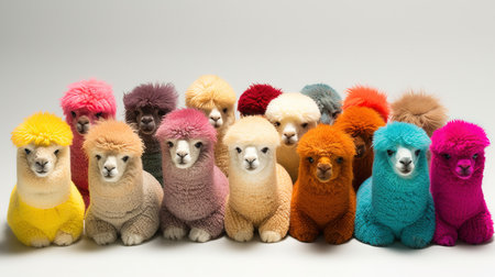 Generative AI, Group of positive different colors Lamas, funny animals. Individuality, independence, think different, creative idea, diversity and inclusive concept.