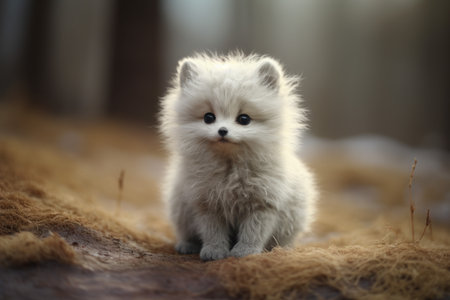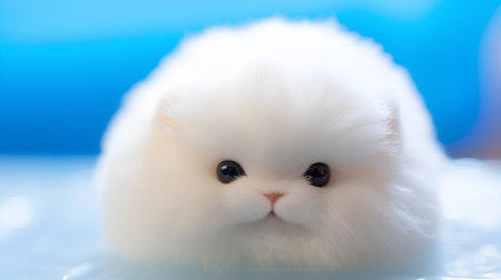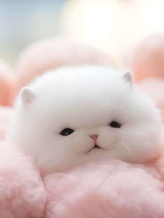 A fluffy white kitten sitting on top of a table. Generative AI image.