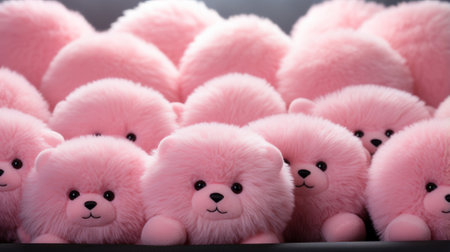 A playful pack of pink plush teddy bears frolics indoors, their furry fabric gleaming in the light and filling the room with a whimsical charm