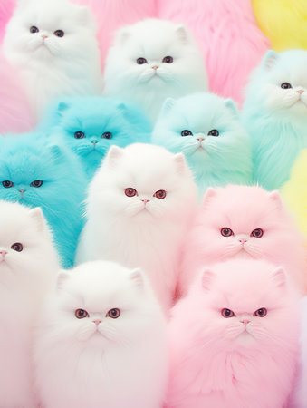 pink, blue and white fluffy cats on a background of feathers