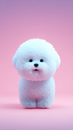 A cute white puppy toy with black eyes and nose, set against a soft pink and blue backdrop.