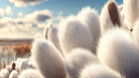 White fluffy fluffy catkins on the background of blue sky with clouds.
