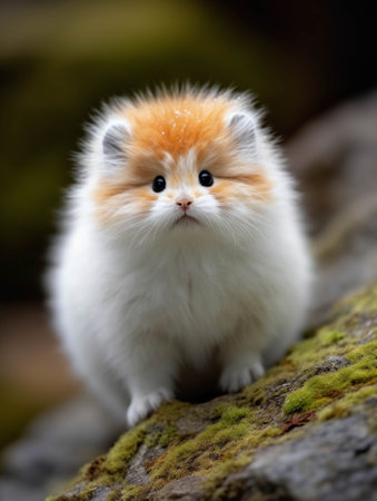 An AI generated illustration of a cute orange and white tabby cat on a moss-covered rock