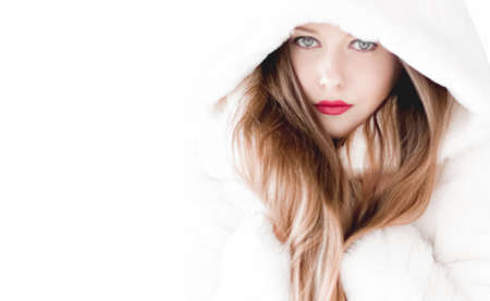 Young woman in fluffy fur coat with hood wrap, warm winter clothing for fashion and Christmas holidays design