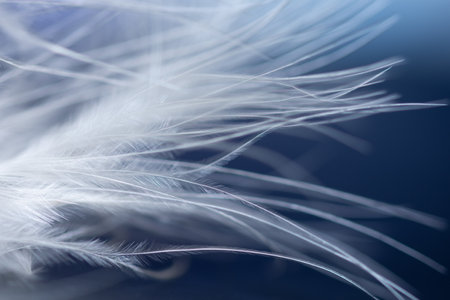 A delicate white feather is captured in a close-up shot, exhibiting intricate textures and details. The feather displays a gentle curve with a golden stem. Set against a blurred dark blue background, the image evokes a sense of tranquility. Suitable for design projects and commercial applications, the image can be used for various purposes.