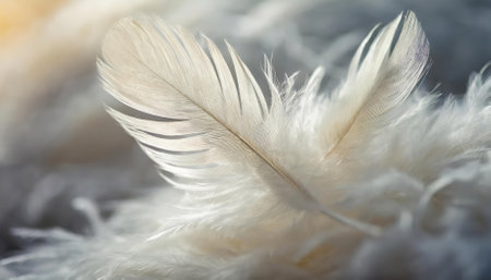 A closeup image of delicate white feathers symbolizing peace, calm, spirituality, and divine connection. This serene background conveys purity and harmony, ideal for religious, meditative, and