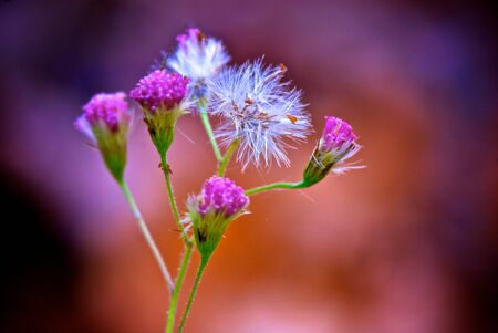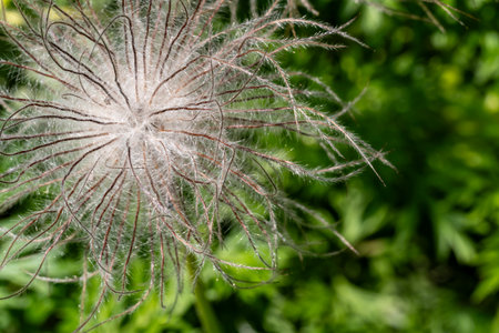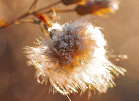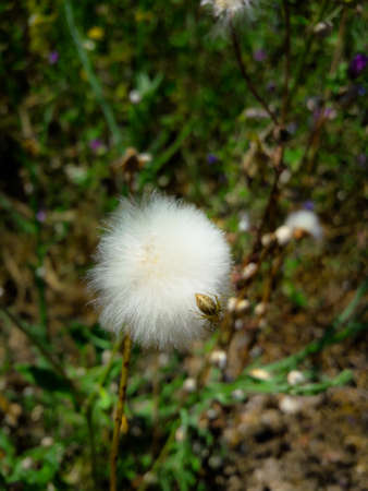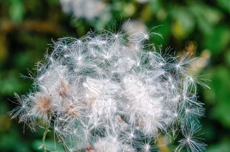 Flowers of thistle seed pods in the meadows. Dispersal of seeds by the wind. Seeding of plants in nature