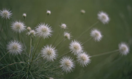 gentle, white bog flower close-up, green background, sunny summer morning, fog in the background, marshy lake shore, Eriophorum vaginatum