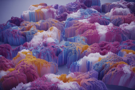 An AI-generated, highly detailed abstract image featuring a dreamlike landscape of organic forms. The textured surfaces are rendered in a rich palette of pastel purples, pinks, blues, and yellows.